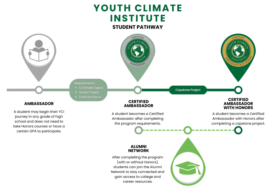 The Youth Climate Institute (YCI) is a one-year, extracurricular program that certifies and celebrates students for their environmental passion and commitment to mitigating climate change. By participating in YCI, you will: